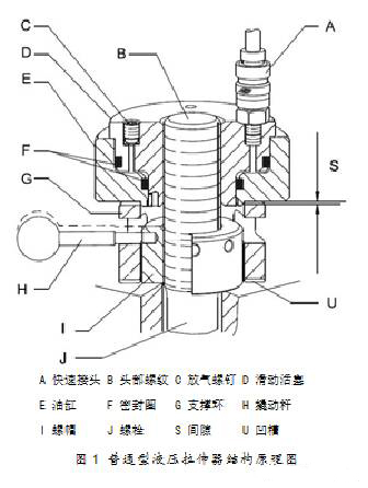 液壓螺栓拉伸器是一種比較先進(jìn)的螺栓裝配方法,特別適用于狹窄空間和重負(fù)荷振動(dòng)機(jī)械堅(jiān)固。其主要部件有(見圖1)滑動(dòng)活塞D、油缸E、支撐環(huán)G、密封圈F、放氣螺釘C和快速接頭A等。液壓螺栓拉伸器的工作原理是液壓螺栓拉伸器安裝于螺栓的上部,滑動(dòng)活塞的內(nèi)螺紋旋到螺栓上部的螺紋內(nèi),從氣動(dòng)液壓油泵來(lái)的高壓油通過快速接頭連接到由油缸E和滑動(dòng)活塞D形成的密封空間內(nèi),液壓油作用在滑動(dòng)活塞上,使滑動(dòng)活塞對(duì)螺栓J施加外力進(jìn)行軸向拉伸,被施加力的螺栓在其彈性變形區(qū)內(nèi)被拉長(zhǎng),螺栓拉長(zhǎng)后旋緊螺帽I,這樣螺栓就會(huì)被鎖在拉長(zhǎng)的位置上。